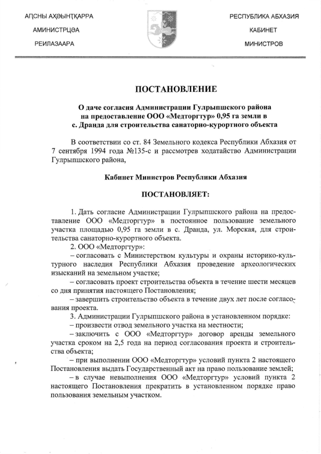Постановление Кабинета Министров Республики Абхазия от 14.03.2018 № 25 "О даче согласия Администрации Гулрыпшского района на предоставление ООО "Медторгтур" 0,95 га земли в с. Дранда для строительства санаторно-курортного объекта"