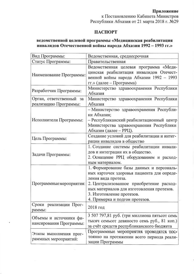 Постановление Кабинета Министров Республики Абхазия от 21.03.2018 № 29 "Об утверждении ведомственной целевой программы "Медицинская реабилитация инвалидов Отечественной войны народа Абхазии 1992-1993 гг."