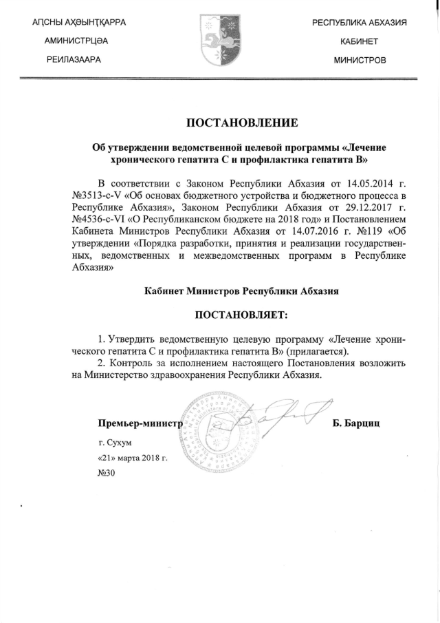 Постановление Кабинета Министров Республики Абхазия от 21.03.2018 № 30 "Об утверждении ведомственной целевой программы "Лечение хронического гепатита С и профилактика гепатита В"