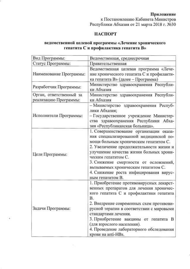 Постановление Кабинета Министров Республики Абхазия от 21.03.2018 № 30 "Об утверждении ведомственной целевой программы "Лечение хронического гепатита С и профилактика гепатита В"