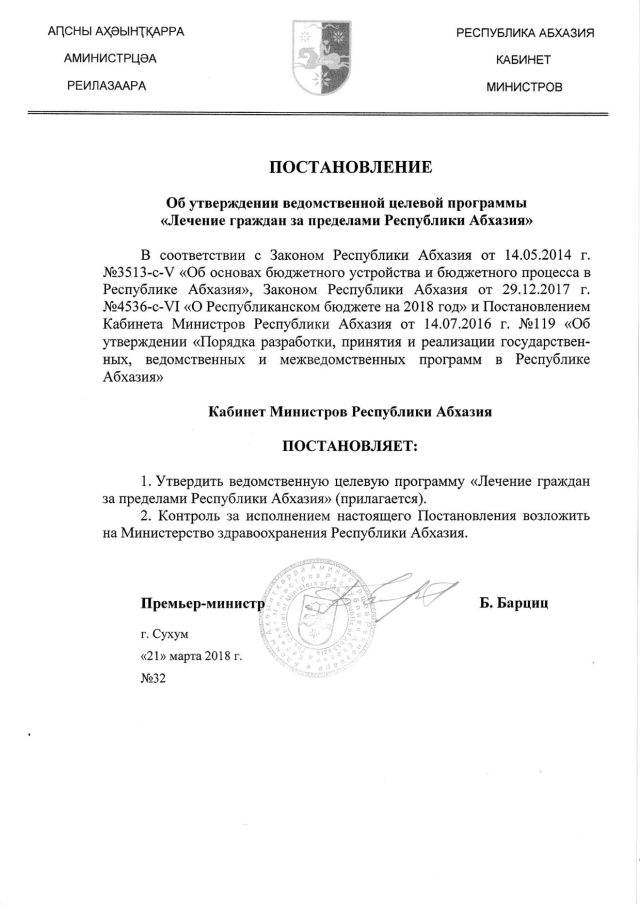 Постановление Кабинета Министров Республики Абхазия от 21.03.2018 № 32 "Об утверждении ведомственной целевой программы "Лечение граждан за пределами Республики Абхазия"