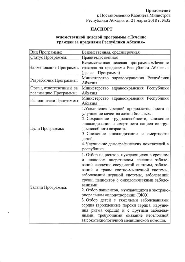 Постановление Кабинета Министров Республики Абхазия от 21.03.2018 № 32 "Об утверждении ведомственной целевой программы "Лечение граждан за пределами Республики Абхазия"