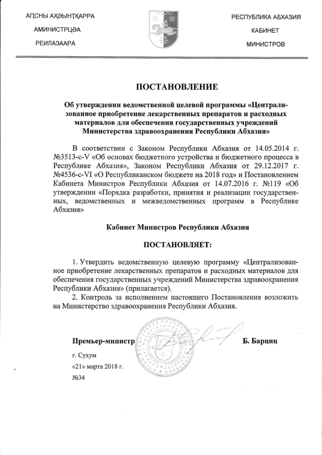 Постановление Кабинета Министров Республики Абхазия от 21.03.2018 № 34 "Об утверждении ведомственной целевой программы "Централизованное приобретение лекарственных препаратов и расходных материалов для обеспечения государственных учреждений Министерства здравоохранения Республики Абхазия"