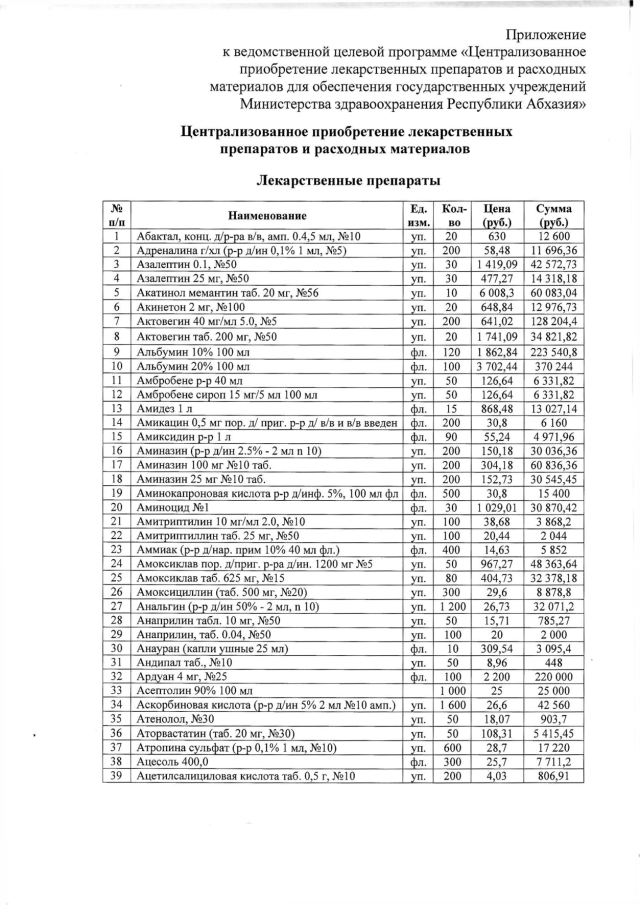Постановление Кабинета Министров Республики Абхазия от 21.03.2018 № 34 "Об утверждении ведомственной целевой программы "Централизованное приобретение лекарственных препаратов и расходных материалов для обеспечения государственных учреждений Министерства здравоохранения Республики Абхазия"