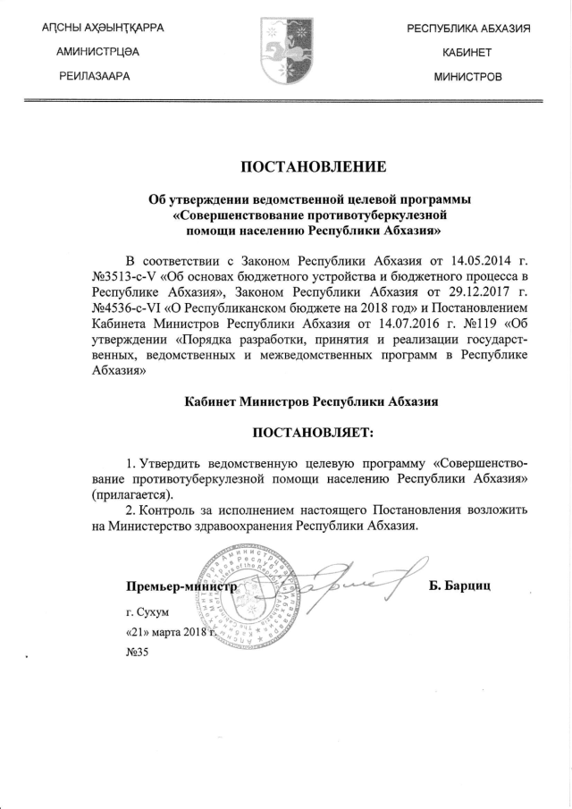 Постановление Кабинета Министров Республики Абхазия от 21.03.2018 № 35 "Об утверждении ведомственной целевой программы "Совершенствование противотуберкулезной помощи населению Республики Абхазия"
