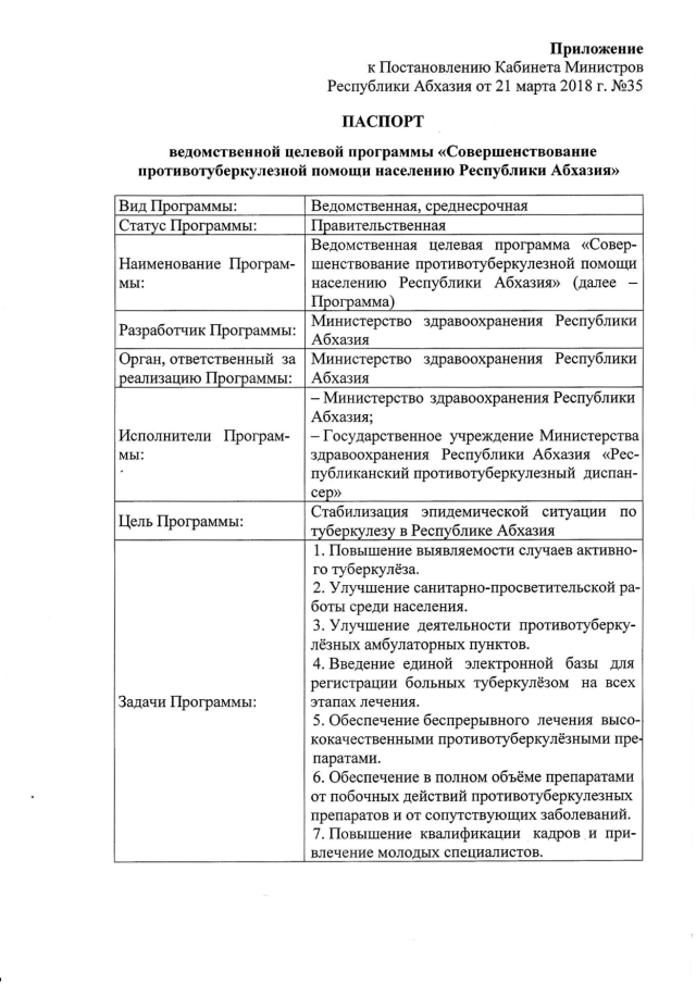 Постановление Кабинета Министров Республики Абхазия от 21.03.2018 № 35 "Об утверждении ведомственной целевой программы "Совершенствование противотуберкулезной помощи населению Республики Абхазия"