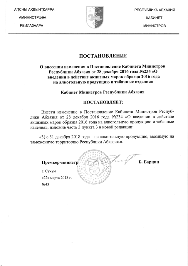 Постановление Кабинета Министров Республики Абхазия от 22.03.2018 № 43 "О внесении изменения в Постановление Кабинета Министров Республики Абхазия от 28 декабря 2016 года № 234 "О введении в действие акцизных марок образца 2016 года на алкогольную продукцию и табачные изделия"
