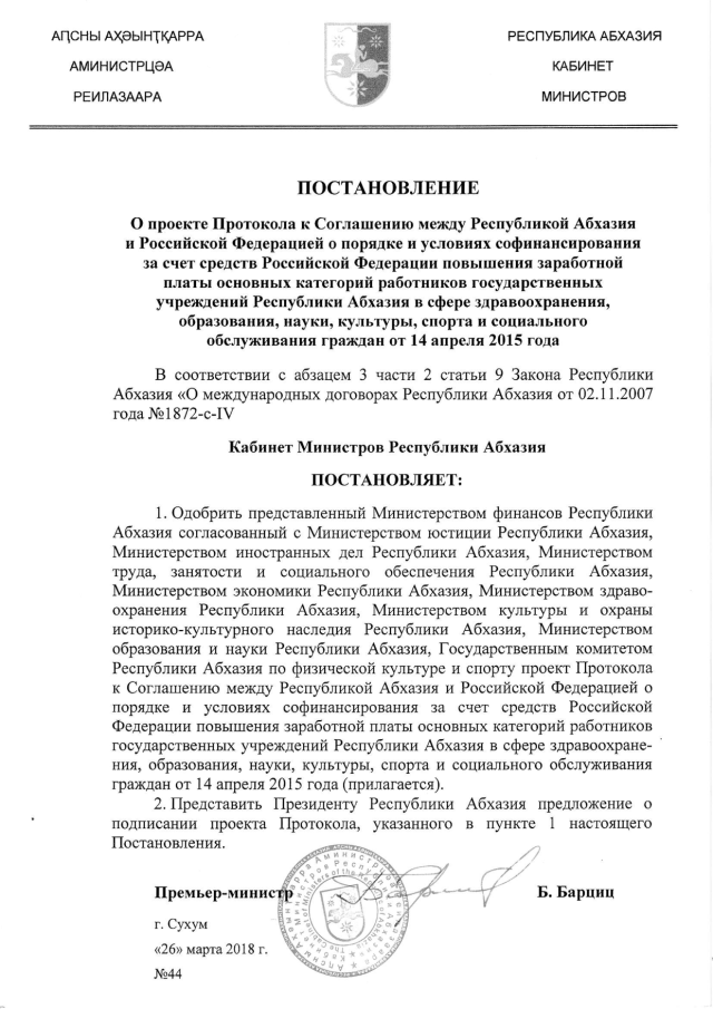 Постановление Кабинета Министров Республики Абхазия от 26.03.2018 № 44 "О проекте Протокола к Соглашению между Республикой Абхазия и Российской Федерацией о порядке и условиях софинансирования за счет средств Российской Федерации повышения заработной платы основных категорий работников государственных учреждений Республики Абхазия в сфере здравоохранения, образования, науки, культуры, спорта и социального обслуживания граждан от 14 апреля 2015 года"