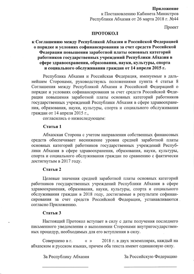 Постановление Кабинета Министров Республики Абхазия от 26.03.2018 № 44 "О проекте Протокола к Соглашению между Республикой Абхазия и Российской Федерацией о порядке и условиях софинансирования за счет средств Российской Федерации повышения заработной платы основных категорий работников государственных учреждений Республики Абхазия в сфере здравоохранения, образования, науки, культуры, спорта и социального обслуживания граждан от 14 апреля 2015 года"