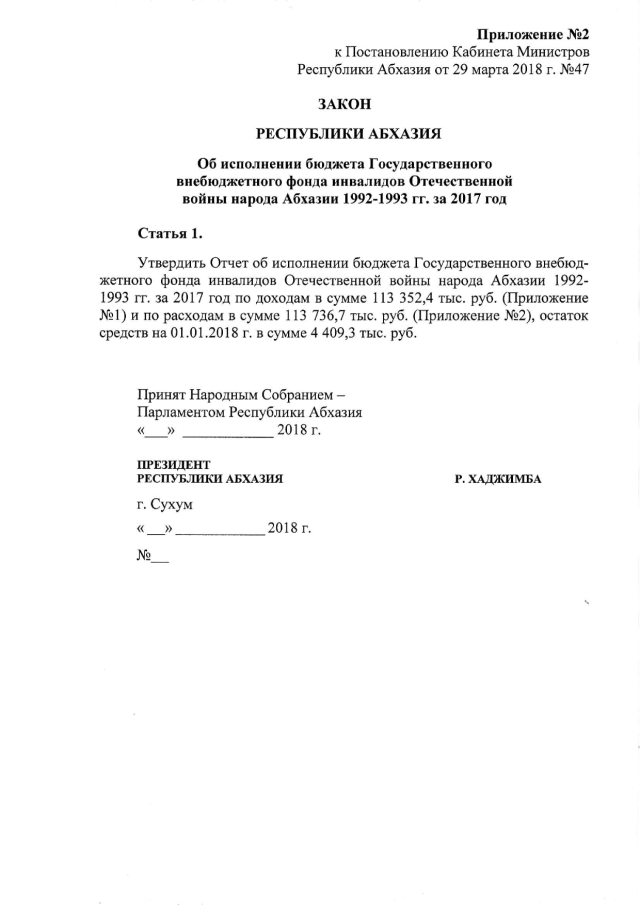Постановление Кабинета Министров Республики Абхазия от 29.03.2018 № 47 "Об исполнении бюджета Государственного внебюджетного фонда инвалидов Отечественной войны народа Абхазии 1992-1993 гг. за 2017 год"