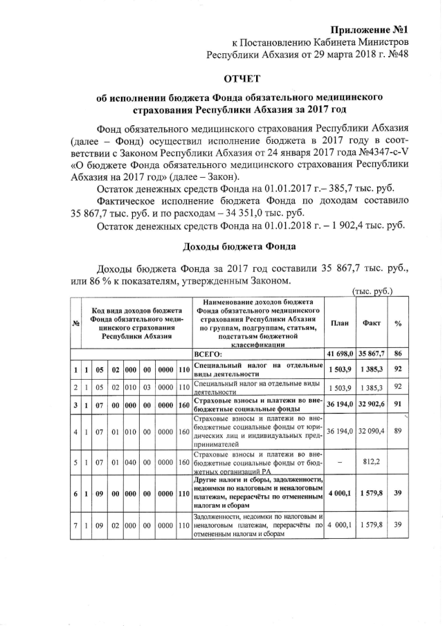 Постановление Кабинета Министров Республики Абхазия от 29.03.2018 № 48 "Об исполнении бюджета Фонда обязательного медицинского страхования Республики Абхазия за 2017 год"