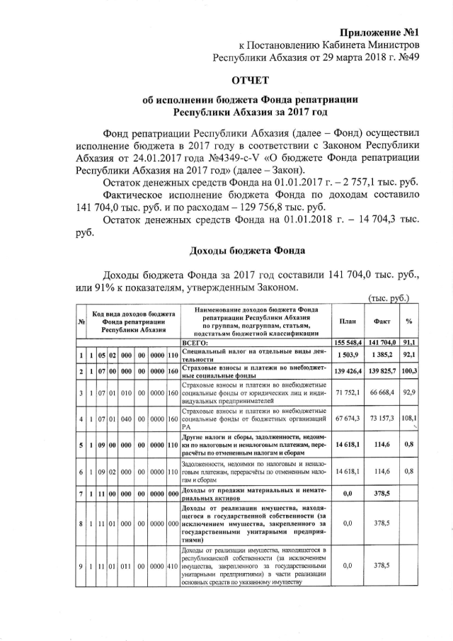 Постановление Кабинета Министров Республики Абхазия от 29.03.2018 № 49 "Об исполнении бюджета Фонда репатриации Республики Абхазия за 2017 год"