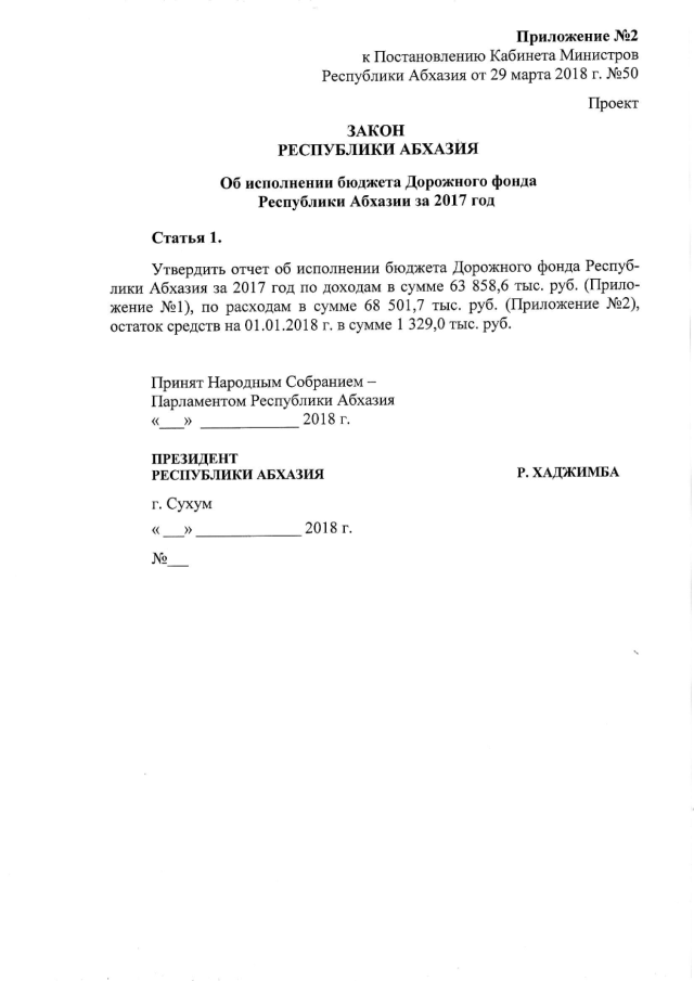 Постановление Кабинета Министров Республики Абхазия от 29.03.2018 № 50 "Об исполнении бюджета Дорожного фонда Республики Абхазия за 2017 год"