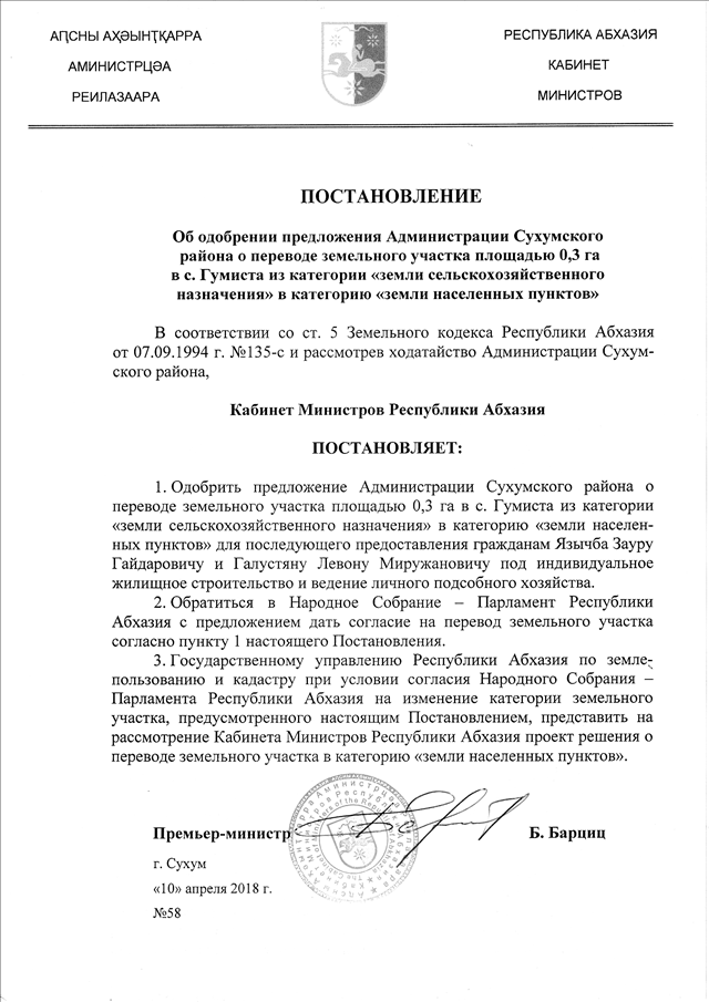 Постановление Кабинета Министров Республики Абхазия от 10.04.2018 № 58 "Об одобрении предложения Администрации Сухумского района о переводе земельного участка площадью 0,3 га в с. Гумиста из категории "земли сельскохозяйственного назначения" в категорию "земли населенных пунктов"