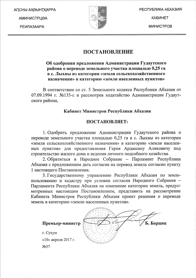 Постановление Кабинета Министров Республики Абхазия от 10.04.2018 № 57 "Об одобрении предложения Администрации Гудаутского района о переводе земельного участка площадью 0,25 га в с. Лыхны из категории "земли сельскохозяйственного назначения" в категорию "земли населенных пунктов"