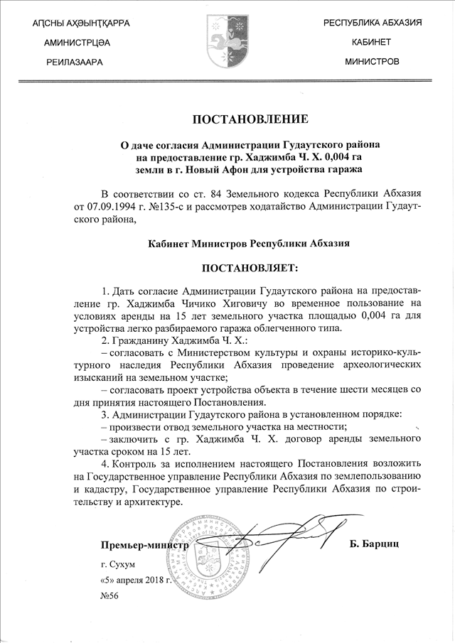 Постановление Кабинета Министров Республики Абхазия от 05.04.2018 № 56 "О даче согласия Администрации Гудаутского района на предоставление гр. Хаджимба Ч. X. 0,004 га земли в г. Новый Афон для устройства гаража"