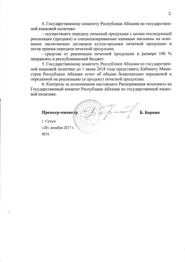 Распоряжение Кабинета Министров Республики Абхазия от 28.12.2017 № 74 "О даче согласия Государственному комитету Республики Абхазия по государственной языковой политике на частичную безвозмездную передачу и реализацию (продажу) учебно-методической литературы и книжной продукции"