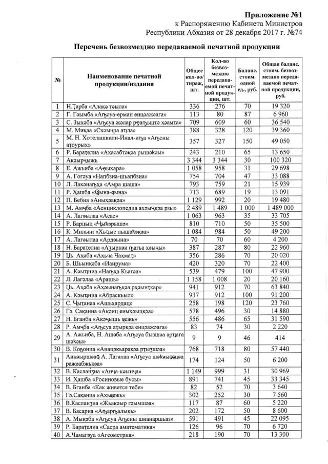 Распоряжение Кабинета Министров Республики Абхазия от 28.12.2017 № 74 "О даче согласия Государственному комитету Республики Абхазия по государственной языковой политике на частичную безвозмездную передачу и реализацию (продажу) учебно-методической литературы и книжной продукции"