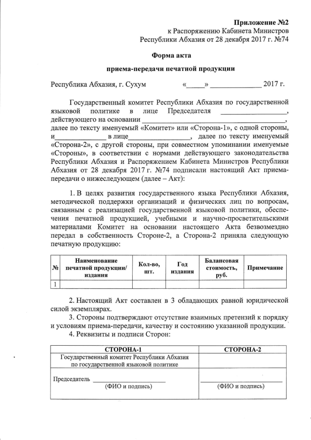 Распоряжение Кабинета Министров Республики Абхазия от 28.12.2017 № 74 "О даче согласия Государственному комитету Республики Абхазия по государственной языковой политике на частичную безвозмездную передачу и реализацию (продажу) учебно-методической литературы и книжной продукции"