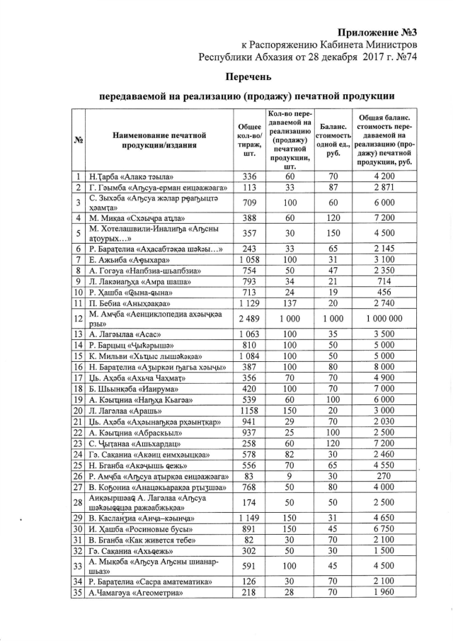 Распоряжение Кабинета Министров Республики Абхазия от 28.12.2017 № 74 "О даче согласия Государственному комитету Республики Абхазия по государственной языковой политике на частичную безвозмездную передачу и реализацию (продажу) учебно-методической литературы и книжной продукции"