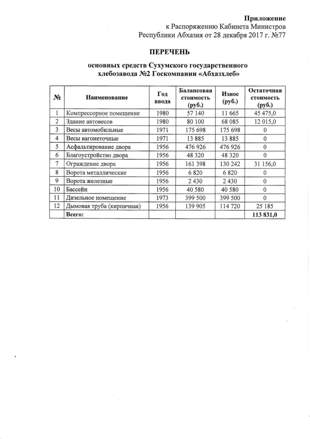 Распоряжение Кабинета Министров Республики Абхазия от 28.12.2017 № 77 "О списании основных средств Сухумского государственного хлебозавода № 2 Госкомпании "Абхазхлеб"
