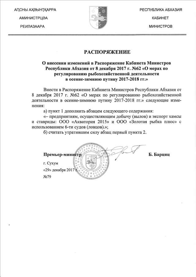 Распоряжение Кабинета Министров Республики Абхазия от 29.12.2017 № 79 "О внесении изменений в Распоряжение Кабинета Министров Республики Абхазия от 8 декабря 2017 г. № 62 "О мерах по регулированию рыбохозяйственной деятельности в осенне-зимнюю путину 2017-2018 гг."