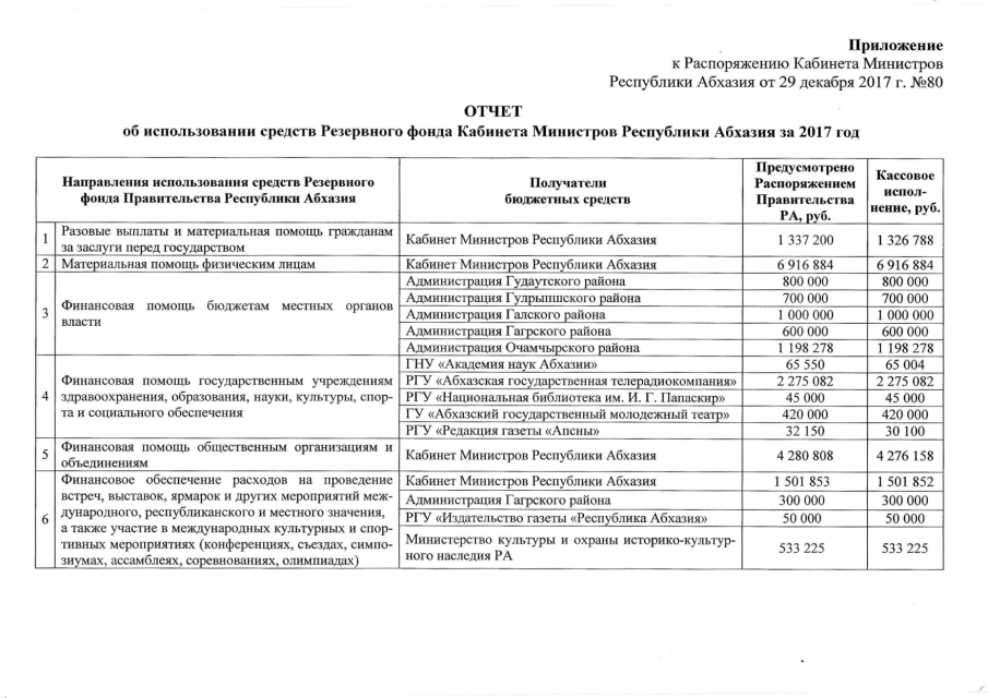 Распоряжение Кабинета Министров Республики Абхазия от 29.12.2017 № 80 "Об утверждении "Отчета об использовании средств Резервного фонда Кабинета Министров Республики Абхазия за 2017 год"