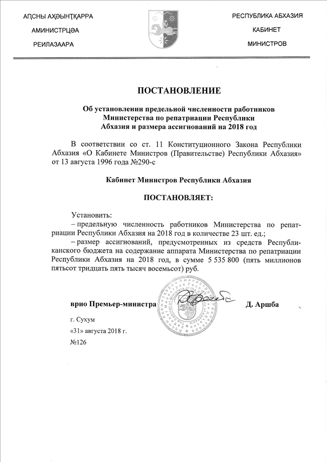Постановление Кабинета Министров Республики Абхазия от 31.08.2018 № 126 "Об установлении предельной численности работников Министерства по репатриации Республики Абхазия и размера ассигнований на 2018 год"