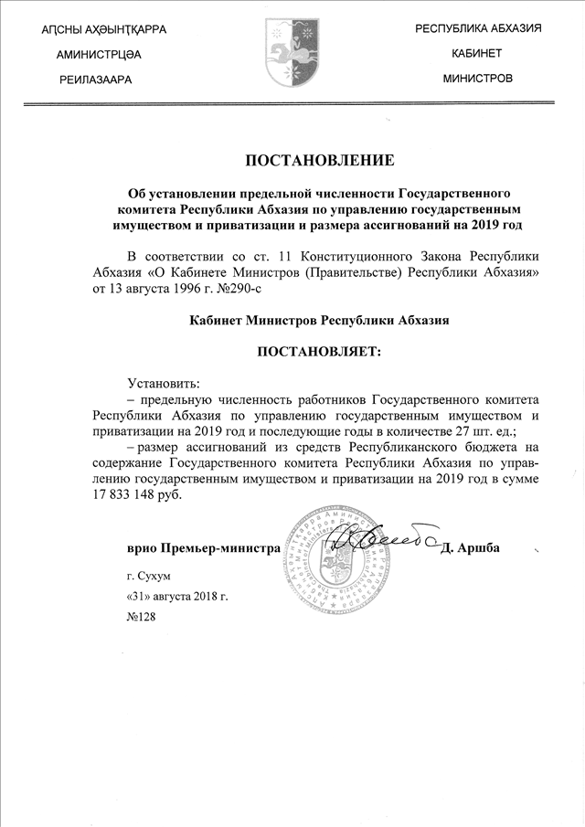 Постановление Кабинета Министров Республики Абхазия от 31.08.2018 № 128 "Об установлении предельной численности Государственного комитета Республики Абхазия по управлению государственным имуществом и приватизации и размера ассигнований на 2019 год"