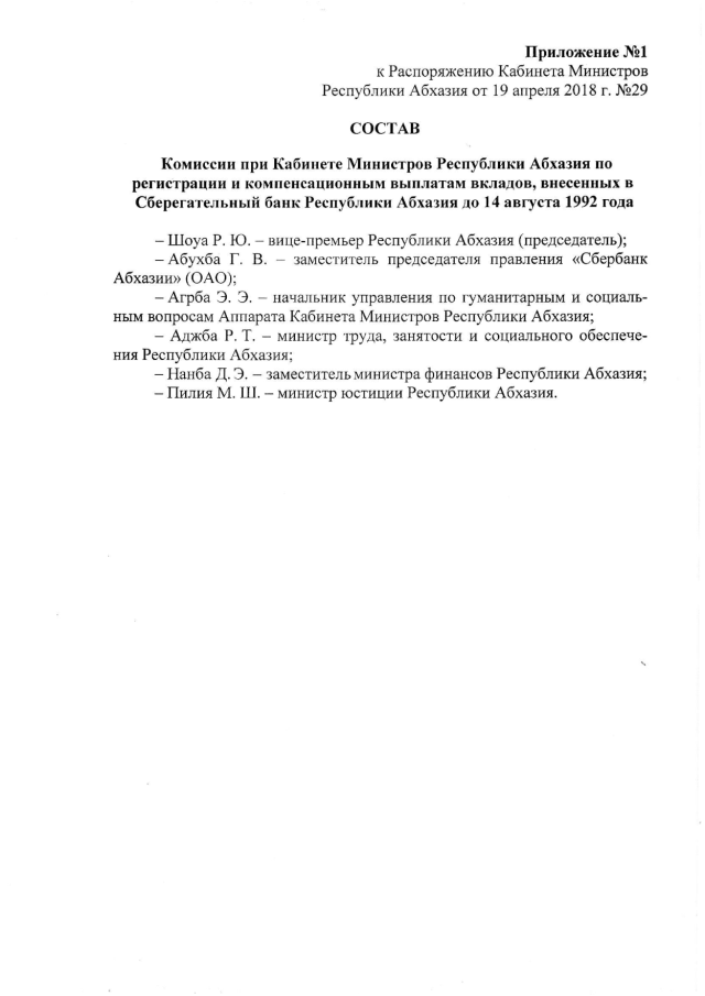 Распоряжение Кабинета Министров Республики Абхазия от 19.04.2018 № 29 "О составе Комиссии при Кабинете Министров Республики Абхазия по регистрации и компенсационным выплатам вкладов, внесенных в Сберегательный банк Республики Абхазия до 14 августа 1992 года"