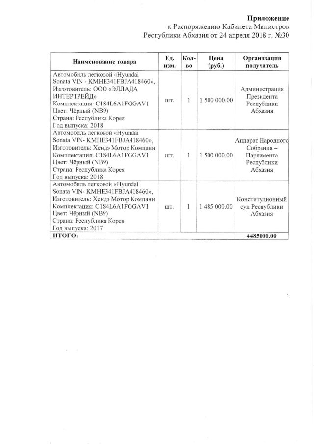Распоряжение Кабинета Министров Республики Абхазия от 24.04.2018 № 30 "О централизованном приобретении и распределении автомобилей Аппаратом Кабинета Министров Республики Абхазия"