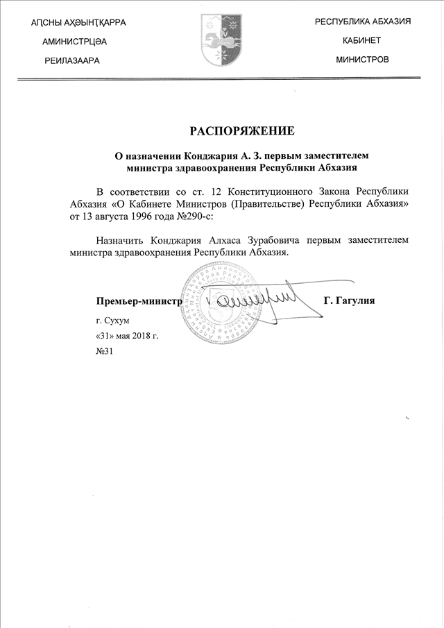 Распоряжение Кабинета Министров Республики Абхазия от 31.05.2018 № 31 "О назначении Конджария А.3. первым заместителем министра здравоохранения Республики Абхазия"