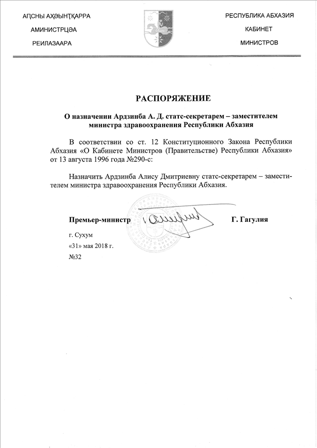 Распоряжение Кабинета Министров Республики Абхазия от 31.05.2018 № 32 "О назначении Ардзинба А.Д. статс-секретарем - заместителем министра здравоохранения Республики Абхазия"