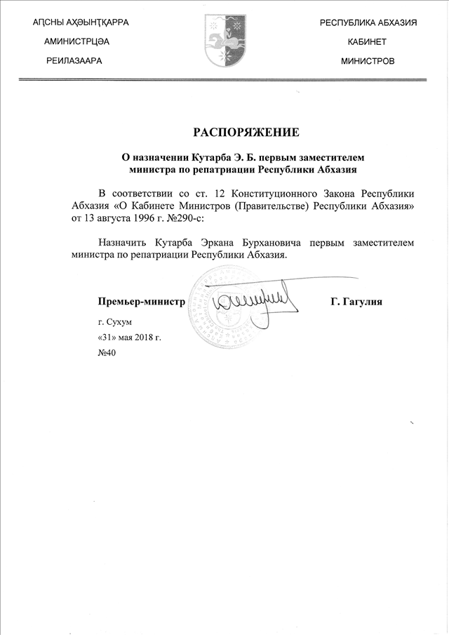Распоряжение Кабинета Министров Республики Абхазия от 31.05.2018 № 40 "О назначении Кутарба Э.Б. первым заместителем министра по репатриации Республики Абхазия"
