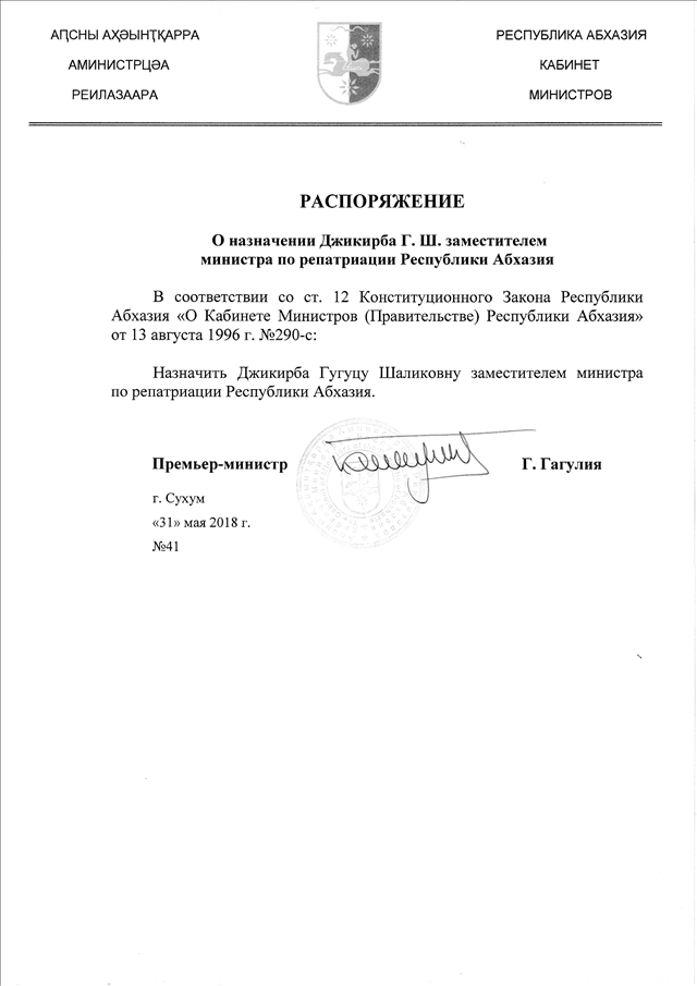 Распоряжение Кабинета Министров Республики Абхазия от 31.05.2018 № 41 "О назначении Джикирба Г.Ш. заместителем министра по репатриации Республики Абхазия"
