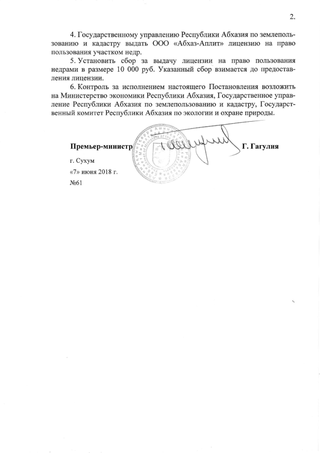 Распоряжение Кабинета Министров Республики Абхазия от 07.06.2018 № 61 "О предоставлении ООО "Абхаз-Аплит" права пользования участком недр месторождения гранита в Гулрыпшском районе"