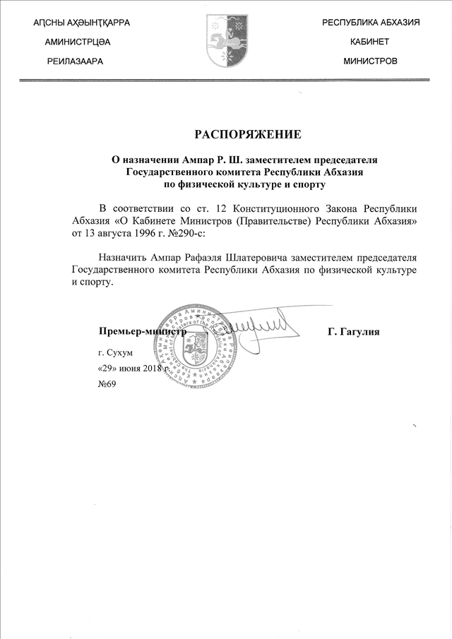 Распоряжение Кабинета Министров Республики Абхазия от 29.06.2018 № 69 "О назначении Ампар Р.Ш. заместителем председателя Государственного комитета Республики Абхазия по физической культуре и спорту"