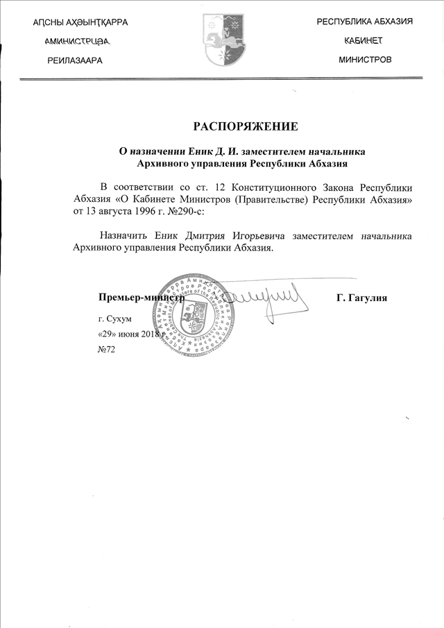 Распоряжение Кабинета Министров Республики Абхазия от 29.06.2018 № 72 "О назначении Еник Д.И. заместителем начальника Архивного управления Республики Абхазия"