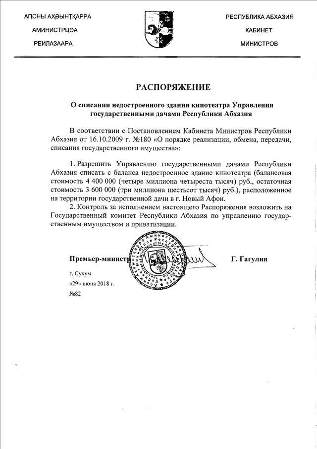 Распоряжение Кабинета Министров Республики Абхазия от 29.06.2018 № 82 "О списании недостроенного здания кинотеатра Управления государственными дачами Республики Абхазия"
