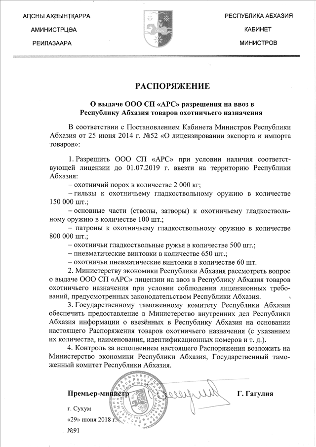 Распоряжение Кабинета Министров Республики Абхазия от 29.06.2018 № 91 "О выдаче ООО СП "АРС" разрешения на ввоз в Республику Абхазия товаров охотничьего назначения"