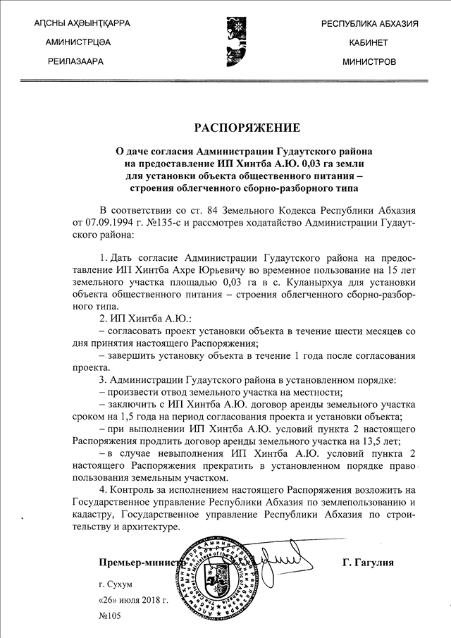 Распоряжение Кабинета Министров Республики Абхазия от 26.07.2018 № 105 "О даче согласия Администрации Гудаутского района на предоставление ИП Хинтба А.Ю. 0,03 га земли для установки объекта общественного питания - строения облегченного сборно-разборного типа"