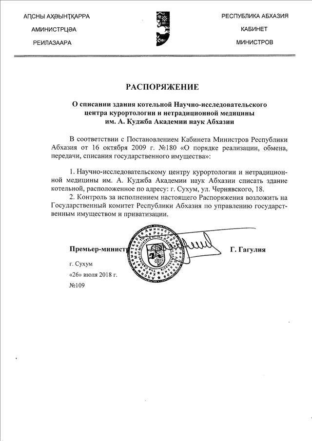 Распоряжение Кабинета Министров Республики Абхазия от 26.07.2018 № 109 "О списании здания котельной Научно-исследовательского центра курортологии и нетрадиционной медицины им. А.Куджба Академии наук Абхазии"