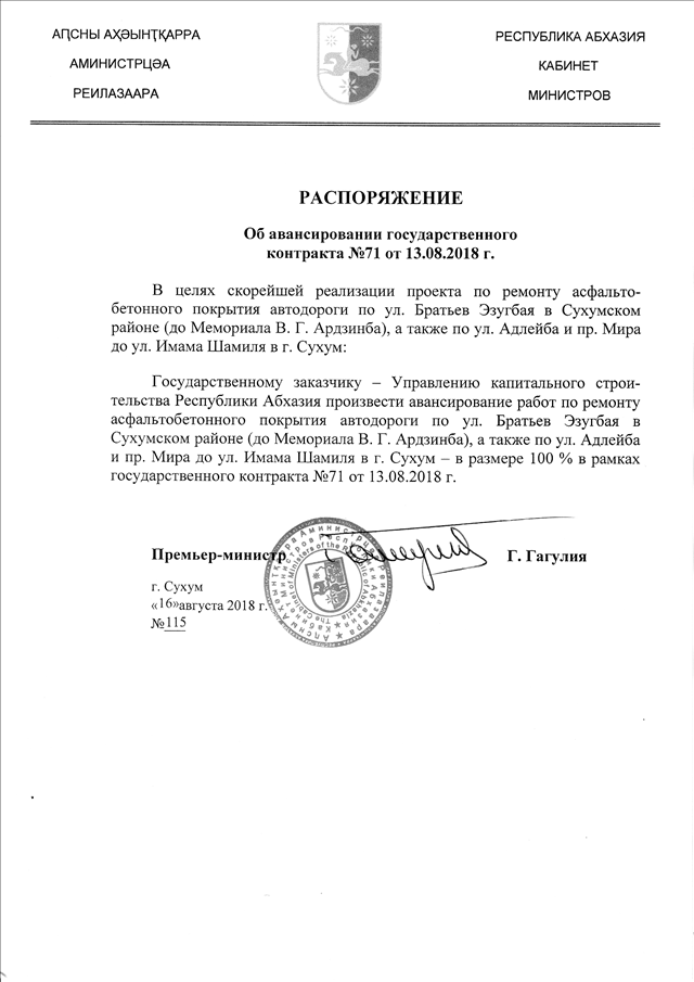 Распоряжение Кабинета Министров Республики Абхазия от 16.08.2018 № 115 "Об авансировании государственного контракта № 71 от 13.08.2018 г."