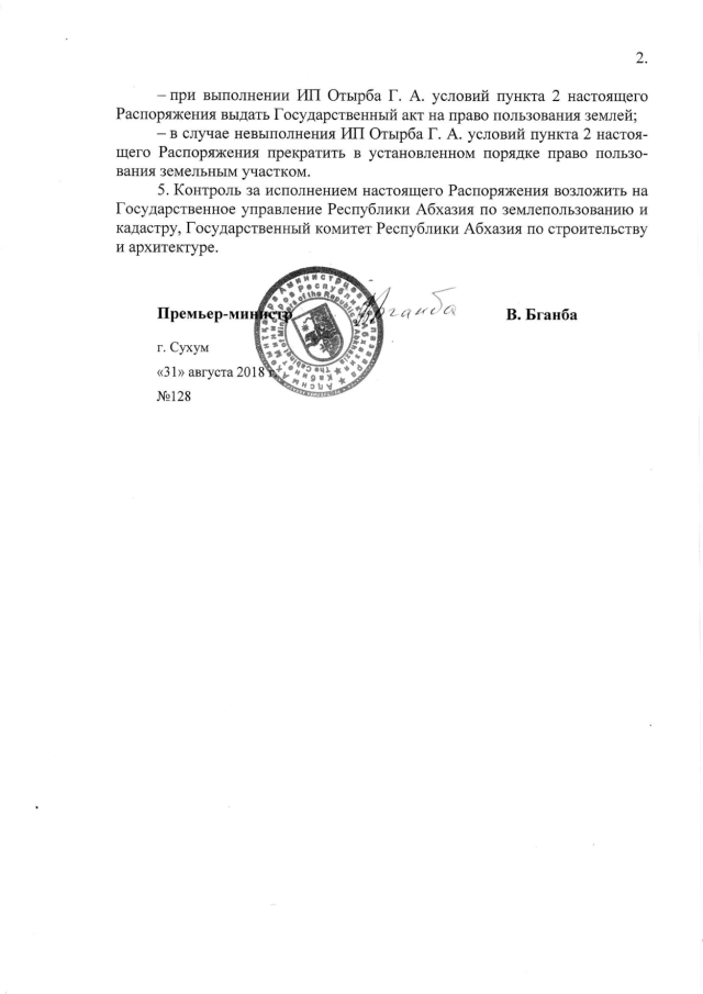Распоряжение Кабинета Министров Республики Абхазия от 31.08.2018 № 128 "О даче согласия Администрации Гудаутского района на предоставление ИП Отырба Г. А. 0,027 га земли для строительства объекта гостиничного типа"