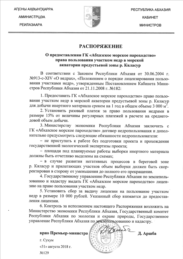 Распоряжение Кабинета Министров Республики Абхазия от 31.08.2018 № 129 "О предоставлении ГК "Абхазское морское пароходство" права пользования участком недр в морской акватории предустьевой зоны р. Кяласур"