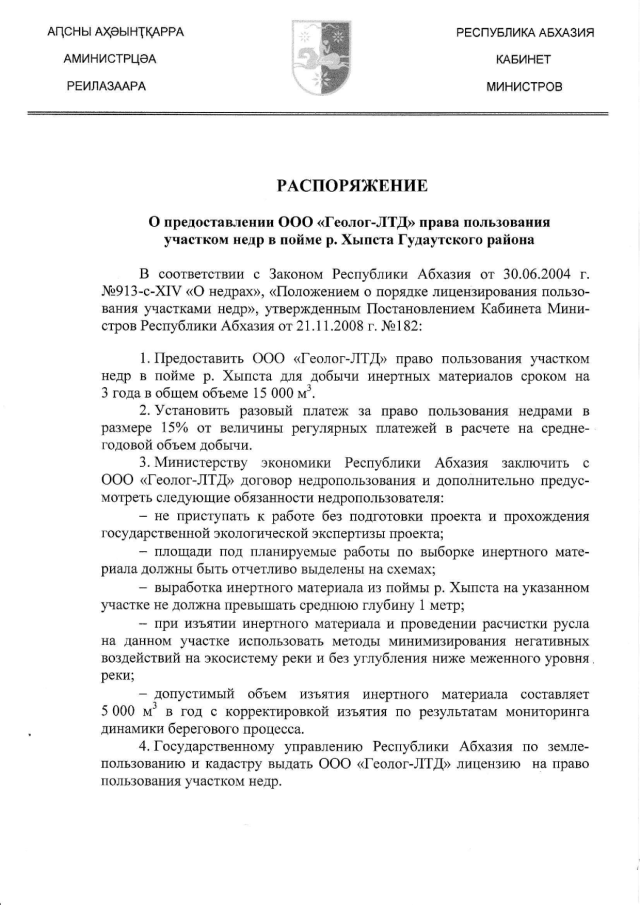 Распоряжение Кабинета Министров Республики Абхазия от 31.08.2018 № 130 "О предоставлении ООО "Геолог-ЛТД" права пользования участком недр в пойме р. Хыпста Гудаутского района"
