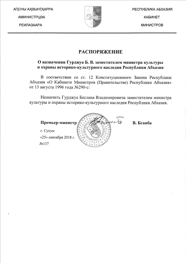 Распоряжение Кабинета Министров Республики Абхазия от 25.09.2018 № 137 "О назначении Гурджуа Б.В. заместителем министра культуры и охраны историко-культурного наследия Республики Абхазия"