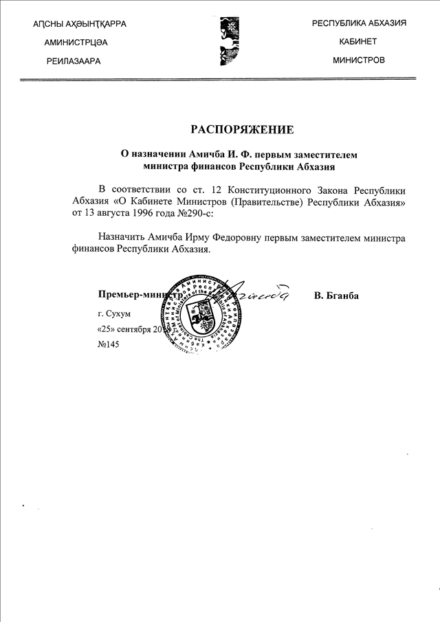 Распоряжение Кабинета Министров Республики Абхазия от 25.09.2018 № 145 "О назначении Амичба И.Ф. первым заместителем министра финансов Республики Абхазия"