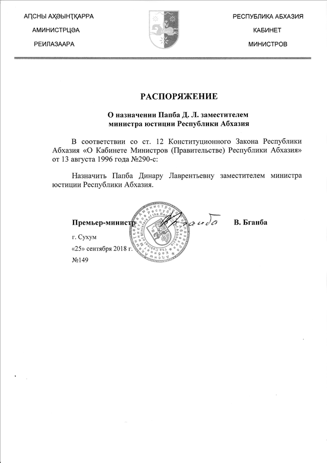 Распоряжение Кабинета Министров Республики Абхазия от 25.09.2018 № 149 "О назначении Папба Д.Л. заместителем министра юстиции Республики Абхазия"