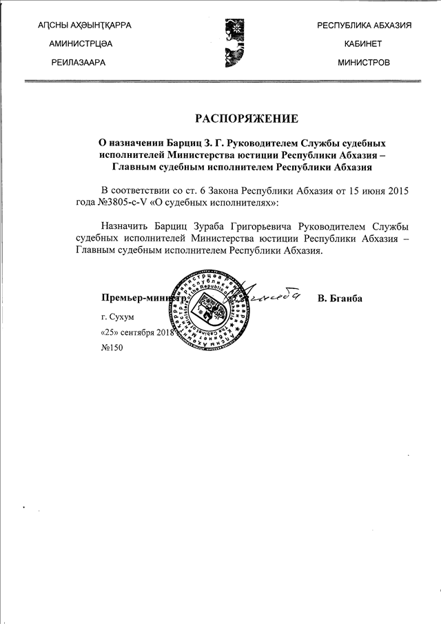 Распоряжение Кабинета Министров Республики Абхазия от 25.09.2018 № 150 "О назначении Барциц 3.Г. Руководителем Службы судебных исполнителей Министерства юстиции Республики Абхазия - Главным судебным исполнителем Республики Абхазия"